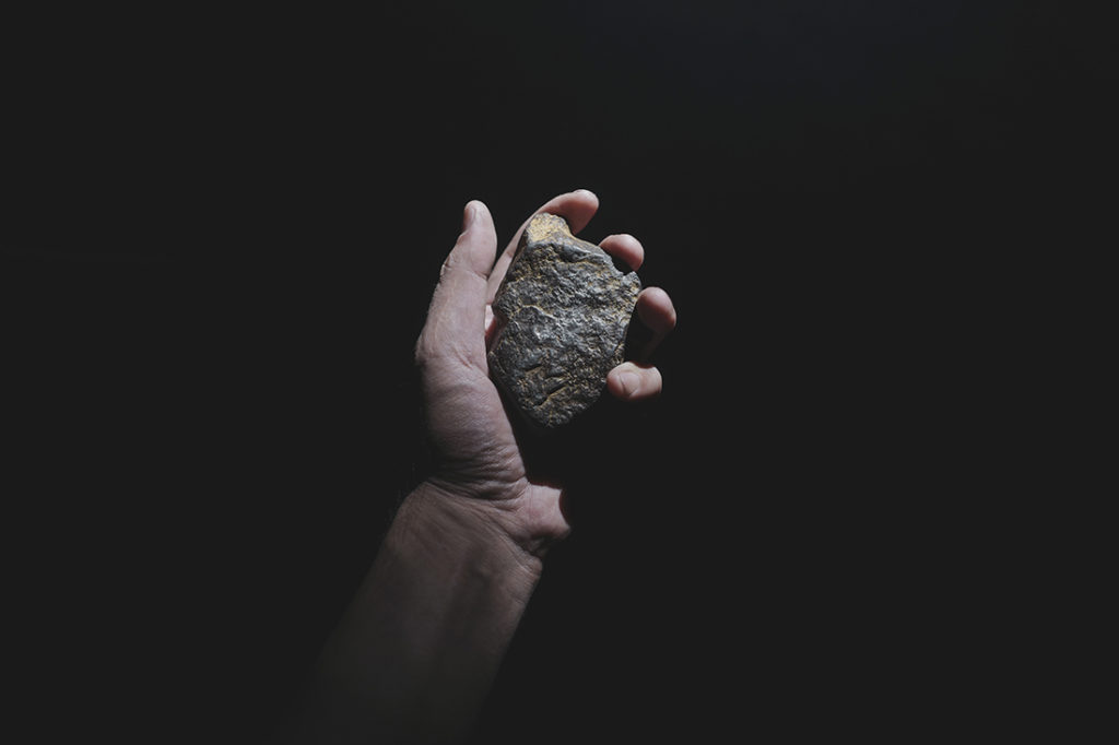 隕石のかけらや鉄屑、ハンマーなどを打ち付けることで